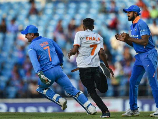 হতবম্ভ অধিনায়ক বিরাট কোহলি একবার ওই ভক্তকে আটকাতে যান। কিন্তু ওই ব্যক্তি কোহলিকে কাটিয়ে যান। শেষে ধোনি নিজেই ধরা দেন।
