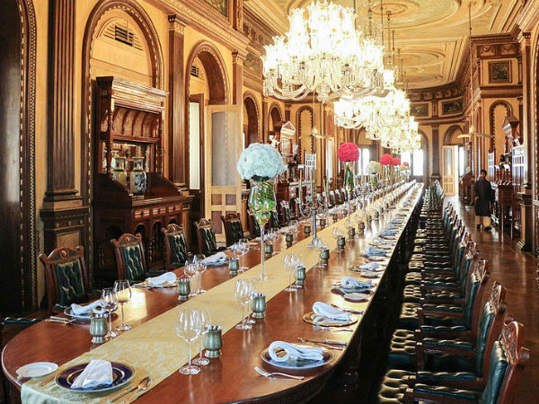 তাজ ফলুকনুমায় রয়্যাল ডিনারের ডাইনিং হলে একসঙ্গে ১০১ জন অতিথি বসে খেতে পারবেন। বিশাল ডাইনিং হলে এতজনকে একসঙ্গে বসানোর ডাইনিং টেবল রয়েছে। পুরো হলটাই কাঠের কাজ করা। বাকী যত আসবাব রয়েছে অথচ টেবলে রাখা থালা, গেলাস থেকে শুরু করে চামচ, ফুলদানি, সবকিছুইতেই রয়েছে রাজকীয় ছোঁয়াচ।