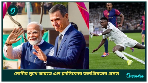 ভারত সফরে এসেছেন স্পেনের প্রধানমন্ত্রী পেড্রো স্যাঞ্চেস। সোমবার সকালে গুজরাতের ভাদোদরায় স্প্যানিশ প্রধানমন্ত্রীকে নিয়ে একটি রোড শো করেছেন নরেন্দ্র মোদী। স্পেনের রাষ্ট্রপ্রধানের সামনে এল ক্লাসিকোর প্রসঙ্গ তুললেন মোদী। গোটা বিশ্বের মতোই ভারতে লা লিগার বিপুল দর্শক আছেন। রিয়াল মাদ্রিদ এবং বার্সেলোনার খেলা থাকলে দুই ভাগে বিভক্ত হয়ে পড়েন ভারতীয় ফুটবলপ্রেমীরাও।