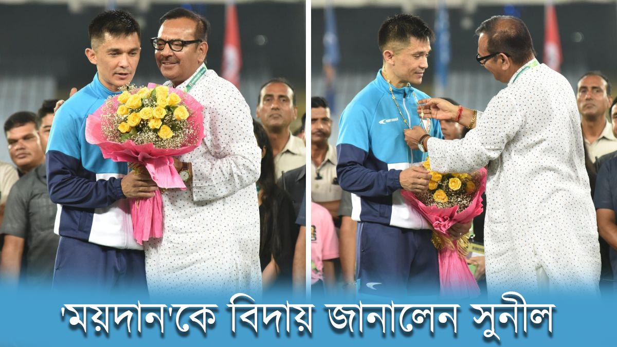 ম্যাচ শেষে মুখ্যমন্ত্রী মমতা বন্দ্যোপাধ্যায়ের হয়ে এদিন কিংবদন্তি সুনীল ছেত্রীকে (Sunil Chhetri) বিদায়ী সম্বর্ধনা জানান ক্রীড়ামন্ত্রী অরূপ বিশ্বাস। তুলে দেওয়া হয় উনিশটা সোনার কয়েন দিয়ে তৈরি সোনার হার, যা একেবারেই মুখ্যমন্ত্রীর নিজের হাতে ডিজাইন করা। হারটি তৈরি করেছে পি সি চন্দ্র জুয়েলার্স। এছাড়াও এদিন সুনীল ছেত্রীর হাতে তুলে দেওয়া হয় স্যুট ,শাড়ি ও ১৯টি গোলাপ।