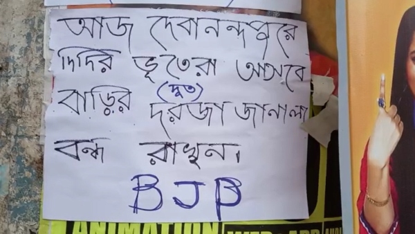 কিন্তু তৃণমূলের কর্মসূচি শুরুর আগেই ব্যান্ডেল স্টেশন চত্বরে পোস্টার পড়াকে কেন্দ্র করে উত্তেজনা তৈরি হল। পোস্টারে লেখা রয়েছে- 'দিদির ভূতেদের (দূত) তাড়াও, দেবানন্দপুর বাঁচাও। অন্য পোস্টারে লেখা- আজ দেবানন্দপুরে দিদির ভুতেরা (দূত) আসবে, বাড়ির দরজা জানালা বন্ধ রাখুন। আর সমস্ত পোস্টারের নীচে লেখা বিজেপি।