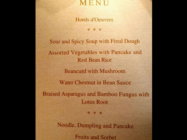 খাবারের তালিকায় ছিল, 'সাওয়ার অ্যান্ড স্পাইসি স্যুপ উইথ ফ্রায়েড ডো', 'অ্যাসোর্টেড ভেজিটেবলস উইথ প্যানকেক অ্যান্ড রেড বিন রাই'। সঙ্গে 'বিনকার্ড উইথ মাসরুম', 'ওয়াটার চেস্টনা ইন বিন সস', 'ব্রেসড অ্যাসপারাগাস অ্যান্ড ব্যাম্বু ফাঙ্গাস উইথ লোটাস রুট'। আর ছিল ন্যুডলস, ডাম্পলিং এবং প্যানকেক। রকমারি ফল আর সরবেট ছিল ডেসার্টের জন্য।