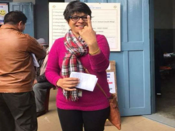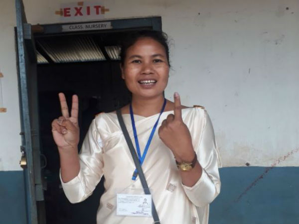 ভোট দেওয়ার পর ভোটগ্রহণ কেন্দ্রের বাইরে মেঘালয়ের নংপো কেন্দ্রের ইউডিপি প্রার্থী রোনা খিমডিট