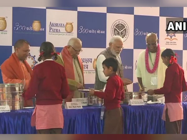 #WATCH: Prime Minister Narendra Modi, CM Yogi Adityanath and Governor Ram Naik serve food to children at "3rd billionth meal" by Akshaya Patra Foundation(works with govt on mid-day meal schemes) in Vrindavan. PM Modi interacts with the students & feeds a student with a spoon pic.twitter.com/itE5LSqQnE