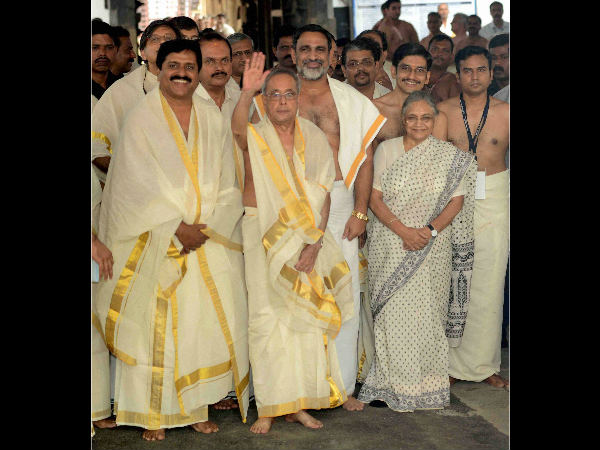 খালি গায়ে ধুতি পরে পদ্মনাভস্বামী মন্দিরে ঢুকছেন রাষ্ট্রপতি প্রণব মুখোপাধ্যায়। (বামদিকে) সঙ্গে শশী তরুর।