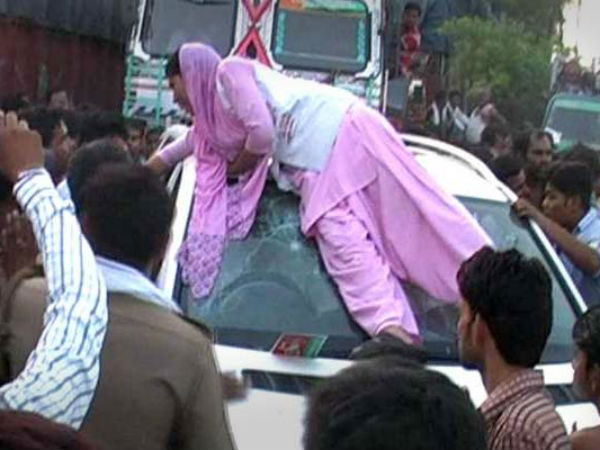 পরনে গোলাপী সালোয়ার কামিজ। মাথা ওড়না দিয়ে ঢাকা সাধবীর বয়স বয়স ২০-র কাছাকাছি। একে দামি তার উপর নেতার গাড়ির উপর ক্ষুব্ধ সাধবী উঠে দাঁড়াতেই হতবাক হয়ে যান স্থানীয় লোকজন।