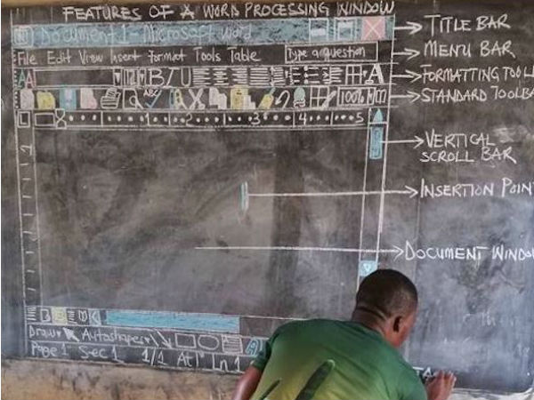 আফ্রিকার দেশ ঘানা কফি উৎপাদনের জন্য বিখ্যাত। তবে দারিদ্রতাও রয়েছে বিস্তর। যে স্কুলের ছবি দেখানো হয়েছে সেটি একটি জুনিয়র হাইস্কুল। নাম বিটানেজ এম-এ জুনিয়র হাইস্কুল। ২০১১ সাল থেকে সেখানে কম্পিউটার নেই। তবে তাতে হতদ্যম হয়ে পড়েননি শিক্ষক রিচার্ড আকোতা। ব্ল্যাকবোর্ডকে এঁকেই ছোটদের মাইক্রোসফ্ট অফিস শেখাতে শুরু করেন।