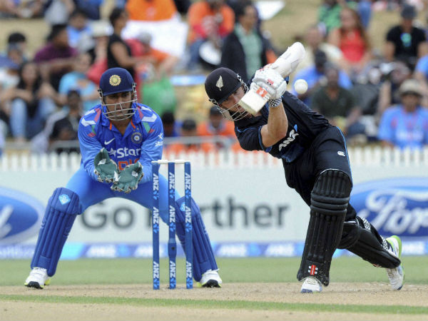 নিউজিল্যান্ডের কেন উইলিয়ামসনের দুর্ধর্ষ শট। দর্শক উইকেটকিপার মহেন্দ্র সিং ধোনি।