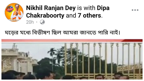 তবে এই নিয়ে দক্ষিণ বিধানসভা কেন্দ্রের বিজেপি বিধায়ক নিখিল রঞ্জন দে' সোশ্যাল মিডিয়ায় বিস্ফোরক একটি পোস্ট করেছেন। যেখানে মমতা আর অনন্ত মহারাজের ছবি দিয়ে দাবি করেছেন, ''ঘরের মধ্যে বিভীষণ ছিল আমরা জানতে পারি নাই''। আর এই পোস্ট ঘিরে শুরু হয়েছে জোর বিতর্ক।