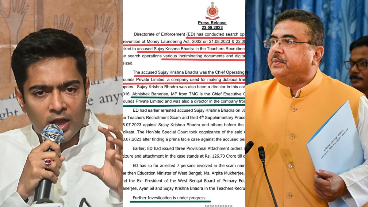 Suvendu vs Abhishek: শিক্ষক নিয়োগ দুর্নীতিতে লিপস অ্যান্ড বাউন্ডসের অফিসে ইডি-র হানা নিয়ে সরগরম রাজ্য-রাজনীতি। আজ সেই সংক্রান্ত একটি প্রেস বিবৃতি প্রকাশ করেছে ইডি। যাতে রয়েছে অভিষেক বন্দ্যোপাধ্যায়ের নাম।