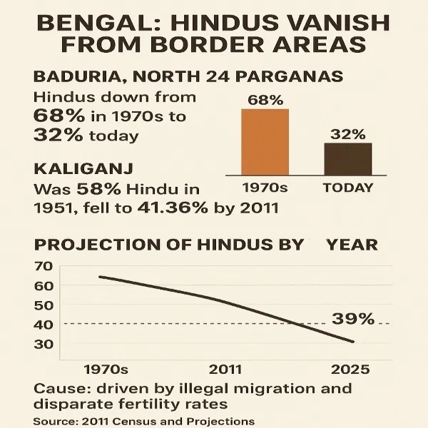 নির্বাচনী লড়াইয়ের বাইরে এই বিষয়টি নিঃসন্দেহে উদ্বেগের। বিশেষত সীমান্বতীত এলাকায় হিন্দু জনসংখ্যার ধীরে ধীরে অবলুপ্তি ঘটছে। এটি মূলত অনুপ্রবেশ এবং পরিকল্পিত চাপের কারণেই ঘটছে। পরিসংখ্যন বলছে, উত্তর ২৪ পরগনার বাদুড়িয়ায় ১৯৭০-এর দশকে হিন্দুদের সংখ্যা প্রায় ৬৮% ছিল। যা আজ কমে ৩২%-এ এসে দাঁড়িয়েছে। ১৯৫১ সালে কালীগঞ্জে ৫৮% হিন্দুর বাস ছিল। যা ২০১১ সালে ৪১.৩৬% এ নেমে আসে। এবং ২০২৫ সালের হিসাবে এই সংখ্যা ৩৯% এর নিচে নেমে যাওয়ার সম্ভাবনা রয়েছে। এর কারণ হল, অবৈধ অভিবাসন এবং অসম প্রজনন হার।