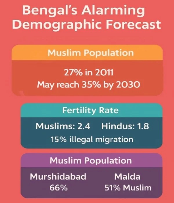 ২০১১ সালে ২৭% মুসলিম, ২০৩০ সালের মধ্যে ৩৫% এ পৌঁছতে পারে। ২.৪ প্রজনন হার (হিন্দুদের হার ১.৮) এবং ৯৬৩ কিলোমিটার উন্মুক্ত সীমানা দিয়ে ১৫% অবৈধ অনুপ্রবেশবড় বিপদ ডেকে আনছে। মুর্শিদাবাদ (৬৬% মুসলিম) এবং মালদা (৫১%) হল আগ্নেয়গিরির মতো, এখানে দুর্গাপুজোও পুলিশ পাহারায় করতে হচ্ছে।