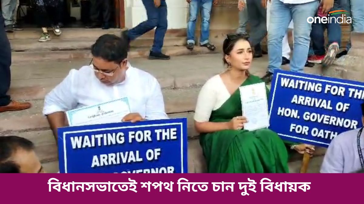 দুই বিধায়ক বুধবার বিধানসভায় এসে স্পিকার বিমান বন্দ্যোপাধ্যায়ের সঙ্গে দেখা করেন। দুপুরের দিকে নব নির্বাচিত দুই বিধায়ক বিধানসভার বাইরে বেরিয়ে আসেন। দুজনের হাতেই প্ল্যাকার্ড দেখতে পাওয়া যায়। বিধানসভাতেই তাঁরা শপথ নেবেন। রাজ্যপাল তাঁদের শপথবাক্য পাঠ করান। এমনই দাবি রয়েছে সেখানে।