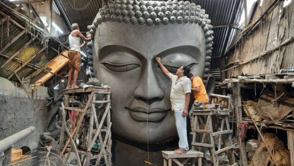 দেশপ্রিয় পার্কের বড় দুর্গার হাত ধরেই এবার বুদ্ধপূর্ণিমায় বুদ্ধগয়াতে প্রতিষ্ঠা হতে চলেছে দেশের সবচেয়ে বড় শায়িত বুদ্ধমূর্তির। সিংহশয্যায় শয়ন করেছিলেন গৌতম বুদ্ধ। বিশ্ব সংসারকে দিয়েছিলেন শান্তির বানী। সেই শয়নমুদ্রাকেই ভাস্কর্যে বন্দি করছে কুমোরটুলি। যার দায়িত্ব পেয়েছেন কুমোরটুলির মিন্টু পাল।